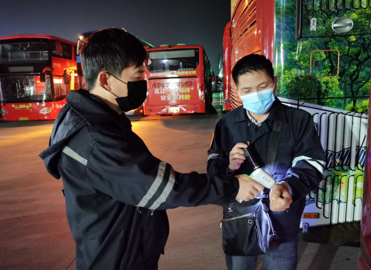 大年初一早上5点45分,当大家都还沉浸在梦乡中时,灵川分公司、始发站场站的公交驾驶员及值班管理人员已早早来到了滨北车场,进行发车前的准备。始发站场站值班安全主管陈华,对驾驶员进行上岗前的酒精及体温测试,今年,已经是他陆续在好几年都在大年三十、初一就开始上班了。