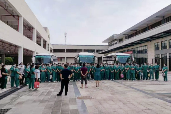 8月8日上午7点,鼎翔旅游调派8辆大巴车护送南溪山医院、博爱医院等市区多家医院200多位医护人员奔赴阳朔召开核酸检测工作。